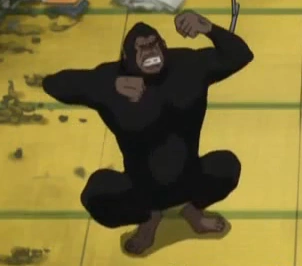 Creator/author of Gintaman under Jump Editor Konishi's charge in Gintama world and the second caricature of Gintama's mangaka, Sorachi Hideaki as a gorilla, this time totally naked without T-shirt. The character for 空 'sora' in 空知 'Sorachi' means the same thing as 天 'ama' in 天知 'Amachi', meaning 'sky/heaven'.verification/corroboration needed